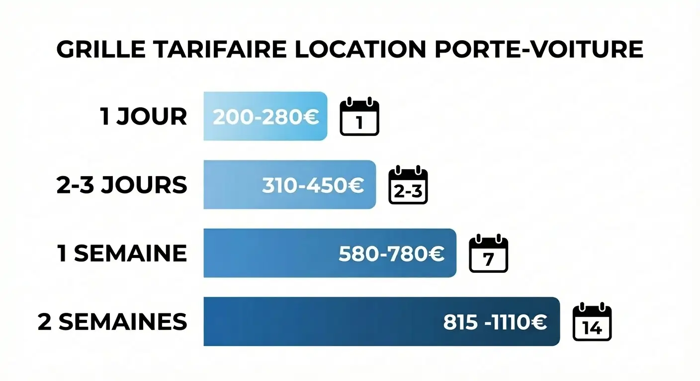 D'après l'analyse de 468 000 recherches sur notre plateforme, le tarif moyen d'un porte-voiture s'établit à 145€/jour. Mais attention aux frais kilométriques : 0,36€/km peuvent transformer une location économique en gouffre financier.